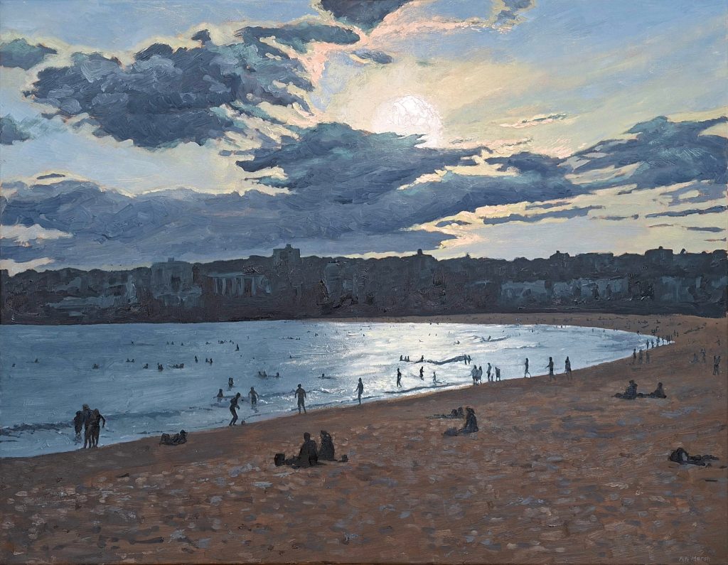 Inspired by the failing light towards the end of the day at Bondi Beach. As the light fades bathers are taking their final swim of the day.