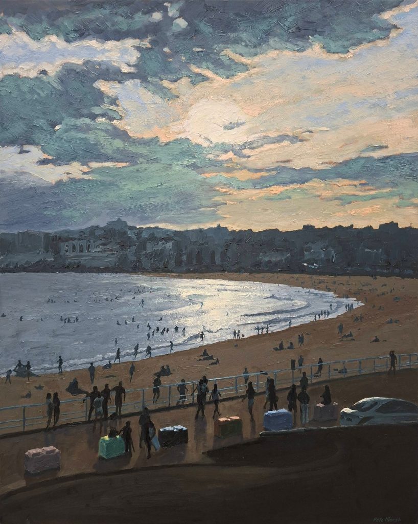 Following a wonderful time on Bondi Beach we dined at North Bondi RSL. This painting is inspired by the view of bathers taking their final swim of the day as the summer sun descends from the sky.