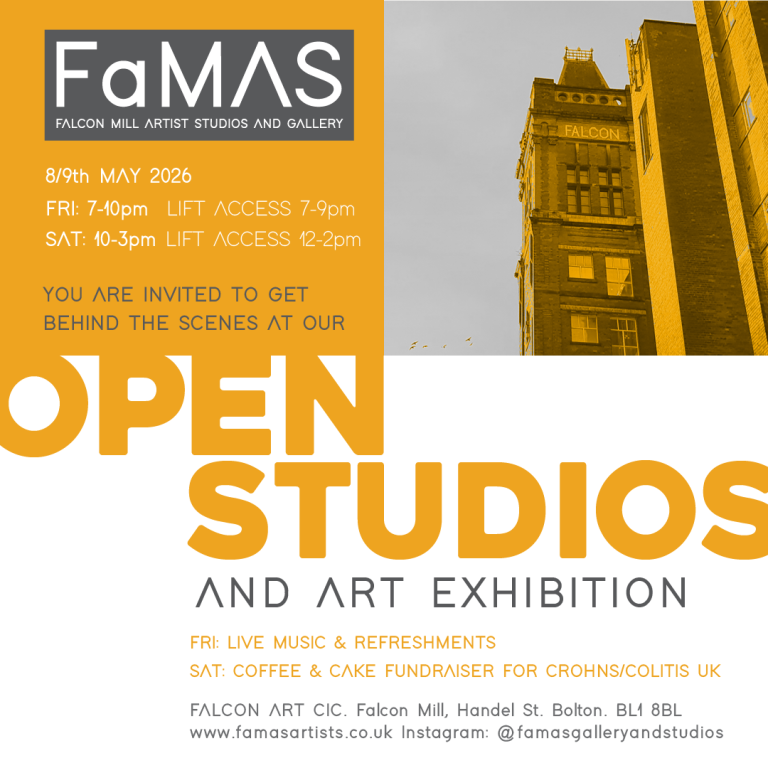 There are now over 50 creatives at FaMAS in studios on Floor 2 and 3 of this Grade II former cotton mill. Do come along to see where the work happens…you are welcome to come inside studios to see the wide variety of different art, chat with the artists or just to see how this old mill is being given a new lease of life.