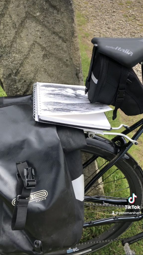Back at “the office” today…sketching wind swept clouds on top of Winter Hill. Nearly 28 miles ridden with over 3000 feet of climbing ably assisted by my new Kinesis Range 50 e-bike. Big shout out to Kinesis bikes and Fazua electric motors for such an awesome road/off-road machine, Green Machine Bike Shop for sourcing everything, Ortlieb for the panniers (got to keep my sketchbook dry!), Torq Fitness for the delicious organic carrot cake flapjack and Ken Bromley Art Supplies for the Conte a Paris pencils.
