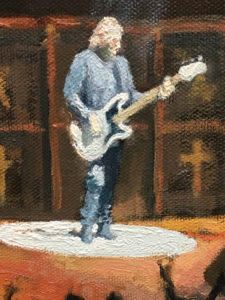 Many, many years ago I bought my first single, it was called Paranoid by Black Sabbath..a band from my native city of Birmingham. I lent it to a friend and never got it back! That must have been around 1970 when I was about 14 years old. On Sunday (so fitting that it was the Sabbath day) 22nd January 2017 I went to Manchester Arena to see Black Sabbath perform as part of “The End” tour and of course to study them for a painting. Throughout a gig I am constantly looking at posture, lighting, the effects of chiaroscuro, composition, colour and all the time trying commit to memory the feelings coursing through venue. Ozzy, Tony Iommi, Geezer, Tommy and Adam did not let us down…I knew that there was a painting in me from this gig…sometimes due to lighting or other visual conditions there is no painting. To be honest there may well be three paintings that could be inspired by this gig along with an etching…but for now here are small details from my oil on canvas titled, “The End”. See under Music/Painting for the full version.