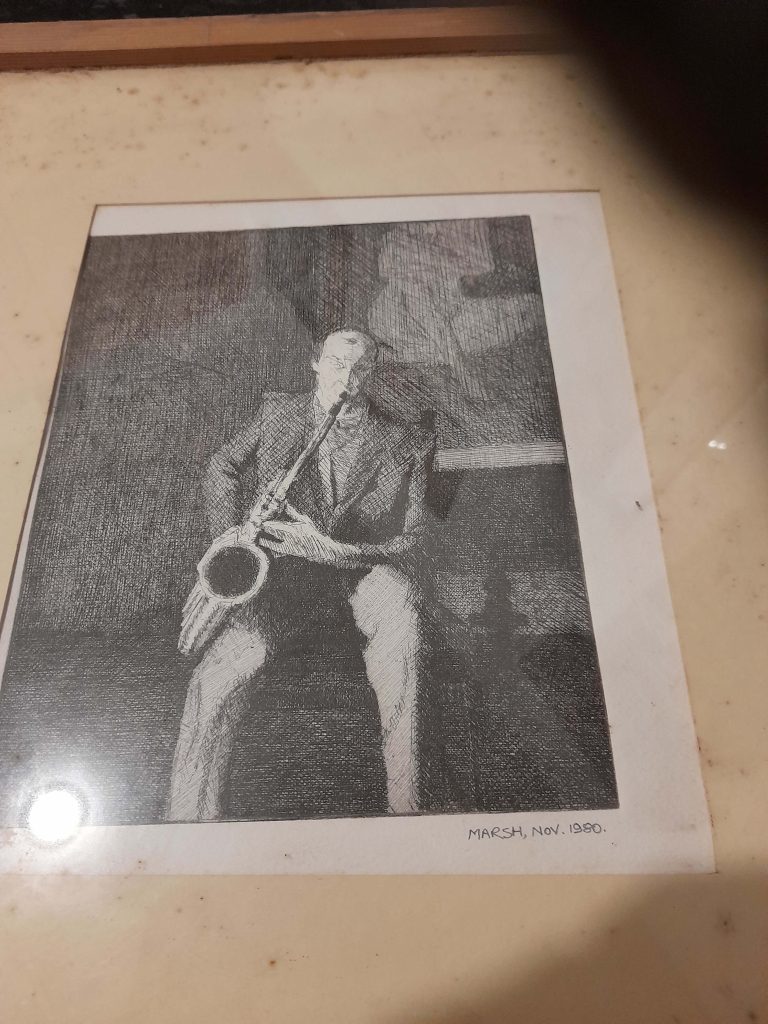The story behind the etching really needs some explanation. My mother’s interest in Jazz had introduced me to the likes of Be-bop and Swing. I decided that I should learn to play the saxophone and my under-graduate friend Jimi Hynd took me to a music shop on Oxford Road, Manchester where I intended to buy an alto saxophone so that I might become the white Charlie Parker! However, whilst trying out different saxophones, I discovered that I preferred the sound of the tenor sax and proceeded to “blow” most of my term’s grant on one! I could not afford lessons, had zero experience in playing any sort of instrument, possessed no natural talent but enjoyed trying to play along to my Coleman Hawkins and Ben Webster records. It is doubtful that my neighbours found any enjoyment from these amateurish dalliances. I produced a small painting, a self portrait playing the saxophone in my student bed-sit. The painting has not survived, at least I have no recollection of what happened to it. I also produced a small limited edition etching. I am sat in front of my dining table which in turn is in front of a large painting of a female nude. The painting was one of three works that I produced inspired by a fellow-art student who had kindly agreed to model for me. None of the three paintings have survived. I thought they were rolled up inside a thick cardboard tube and were in storage in my garage. When it came to demolishing the garage (about ten years ago), I was surprised to find the cardboard tube to be empty. Somewhere during a house-move I must have lost these three paintings. The etching lives on though! Originally it was an edition of six and I can account for four…I have two at my studio and my records indicate that another was sold in a gallery in Newcastle in recent years and we know the whereabouts of the one in Dover. So there would appear to be two more out there somewhere!
