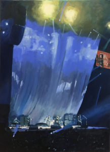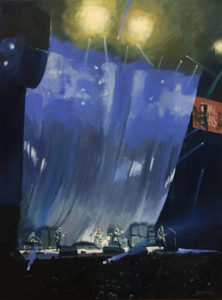 Black Sabbath were supported by Rival Sons during their “The End” tour. I am sure that many bands would jump at the opportunity of supporting one of the most famous bands on their final tour but how many could cut the mustard? The choice of Rival Sons proved to be an excellent one as they rocked the cavernous Manchester Arena with their own brand of hard rock. Jay Buchanan brought a smile to my face when he announced that supporting Black Sabbath was a dream come true…and what a support they were! Rival Sons produced a performance of such drive and intensity that I never once thought of when Sabbath would take the stage. Even though I try to relax and enjoy the music at a concert, I cannot help but “work” during a gig. I am constantly searching for little visual nuances that characterise the performers. I commit all sorts of things to memory in the hope of using some in a painting or original print. During the Rival Sons set I really liked the way Dave Beste on bass just seemed so solid…almost architectural in his pillar like pose. He looked just like he sounded…laying down the rhythm with such authority. Scott Holiday “Mr Fuzz Lord” contrasted Beste in that he pulled some classic “guitar hero” poses looking super cool throughout. I knew that I wanted to paint him near his monitor where he was set against a dark background. I also knew that I wanted the blue Firebird in my painting. Let’s face it, there were plenty of Scott’s guitars from which to choose…but the blue Firebird seemed to epitomise him and fit with the lighting better than any of the others. There’s something about a Gibson Firebird that sets it out as a ROCK guitar. I am sure there are exceptions but really, it just wouldn’t look right in a Reggae band, Indy band, Folk or Jazz band…it’s gotta be Rock. Much later (and after I had completed the painting) I was to discover that this is the one he uses most during live performance, “.. It’s a real rock and roll machine. I love it. It’s my number one. This is the guitar I use the most on stage, definitely.” When I read this I felt my decision had been endorsed. The huge curtain draped behind Mike Miley’s drum kit provided a dramatic backdrop and also went some way in describing the scale of the venue. I’ve been working on a few canvasses over the last few weeks and this one is probably finished…if it isn’t then it isn’t far off. I now need to turn it to the wall for a day or two before looking at it again with fresh eyes. Here it is…I hope it expresses something of the band’s performance.